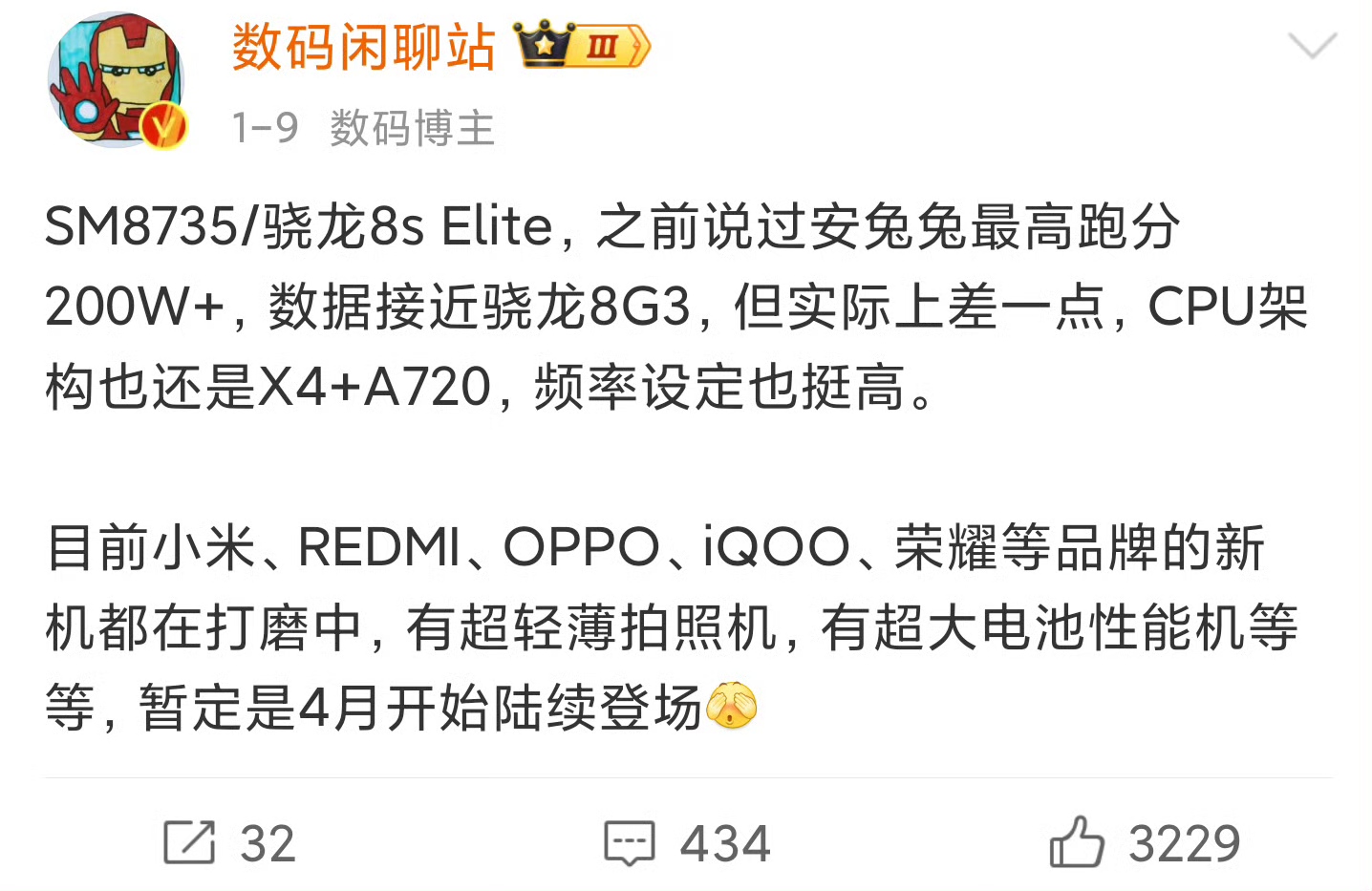 数码闲聊站透露,高通骁龙8s Elite预计最快4月登场,与前代一样,由小米Civi系列新机首发,或为小米Civi5 Pro。不仅仅是小米,首批搭载骁龙8s Elite的机型还包括一款配备6000毫安时主打长续航的次旗舰新机、以及一款首发7500毫安时大容量的中端机型。