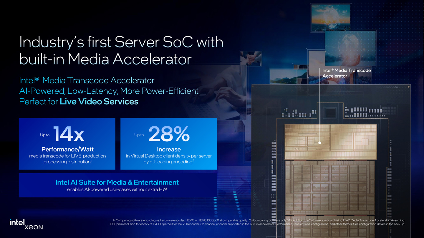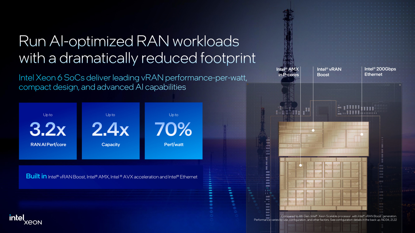 英特尔表示至强 6 SoC 相较前几代产品可带来高达 2.4 倍的 RAN 无线接入网容量和 70% 的能效提升;同时至强 6 SoC 也是首款内置媒体加速器的服务器 SoC,可提升至高 28% 的虚拟桌面用户容量。