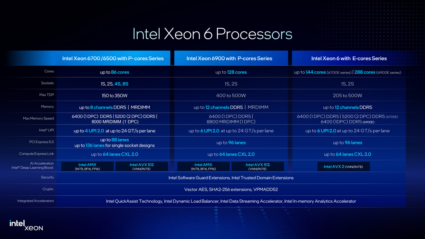 IT之家 2 月 25 日消息,英特尔今日宣布推出面向通用服务器负载的至强 6700/6500P "Granite Rapids-SP" 和聚焦网络和边缘(IT之家注:即 NEX)应用的至强 6 SoC "Granite Rapids-D" 处理器,完善了至强 6 性能核处理器家族。