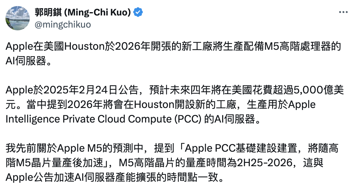 1.郭明錤:苹果美国AI服务器工厂2026年开张 采用高端M5芯片