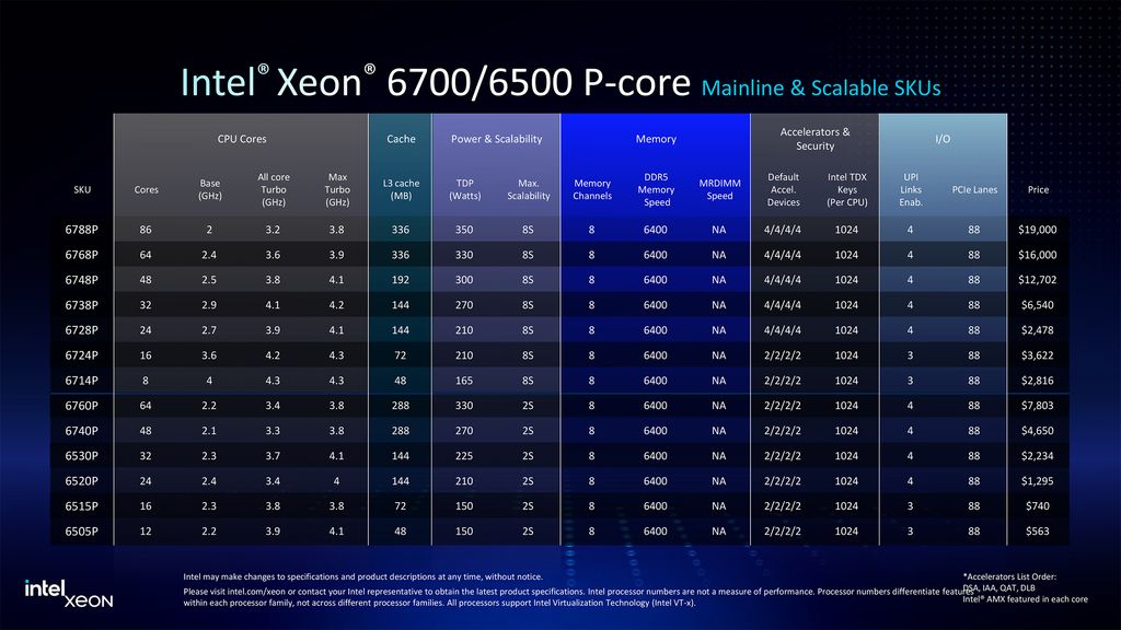 可以说,英特尔此举旨在确保其最昂贵的Xeon 6900P系列处理器仍是性能要求高的工作负载的首选。然而,如果一家公司希望构建具有尽可能多核心(688个)的8路机器,它将不得不选择Xeon 6700P CPU。