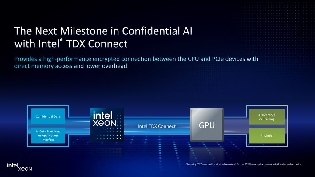 英特尔Xeon 6500和Xeon 6700系列处理器的一个显著特性是支持英特尔TDX Connect技术,该技术可实现CPU与PCIe设备之间的加密连接,具有直接内存访问和较低的开销,从而允许将机密数据传输到GPU进行处理,这将有助于提升各种工作负载的性能,包括AI。