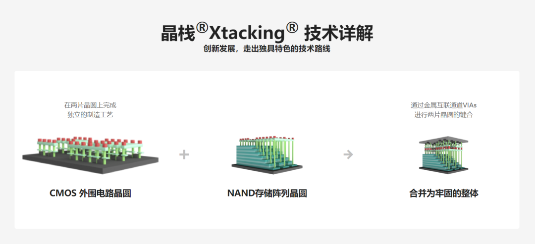 具体点说就是先在一块晶圆上制造存储单元,然后在另一块晶圆上制造控制电路,最后再把两块晶圆通过数百万根垂直通道直接键合,而且中间不用加任何 “ 胶水 ”( 比如传统封装用的凸点 )。