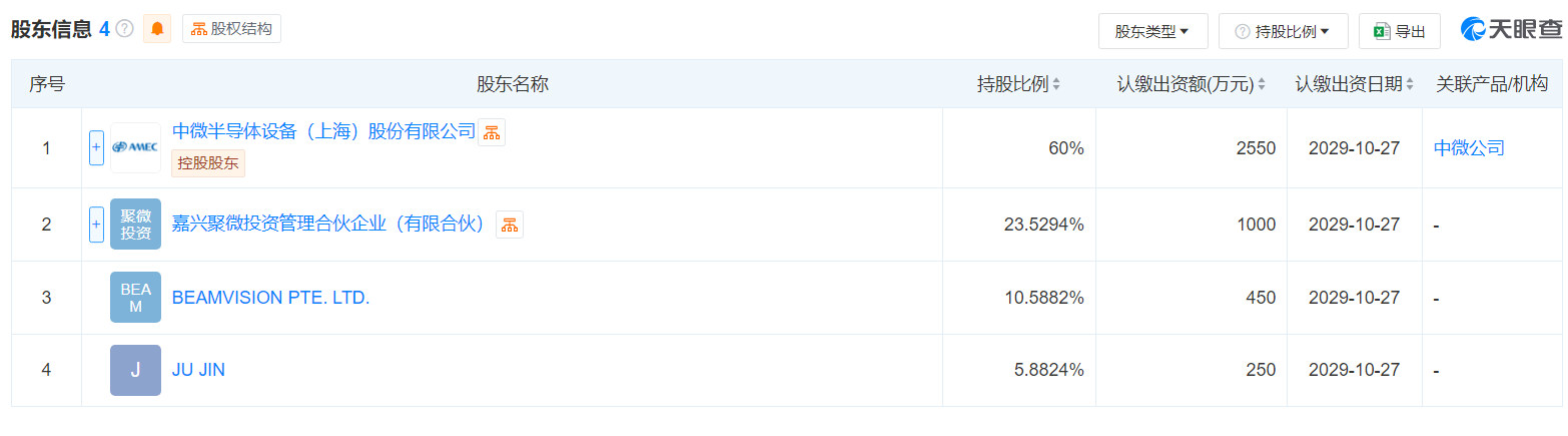 天眼查显示,超微半导体设备(上海)有限公司注册成立于2024年11月22日,法定代表人为尹志尧,其控股股东为中微半导体设备(上海)股份有限公司(持股60%)。