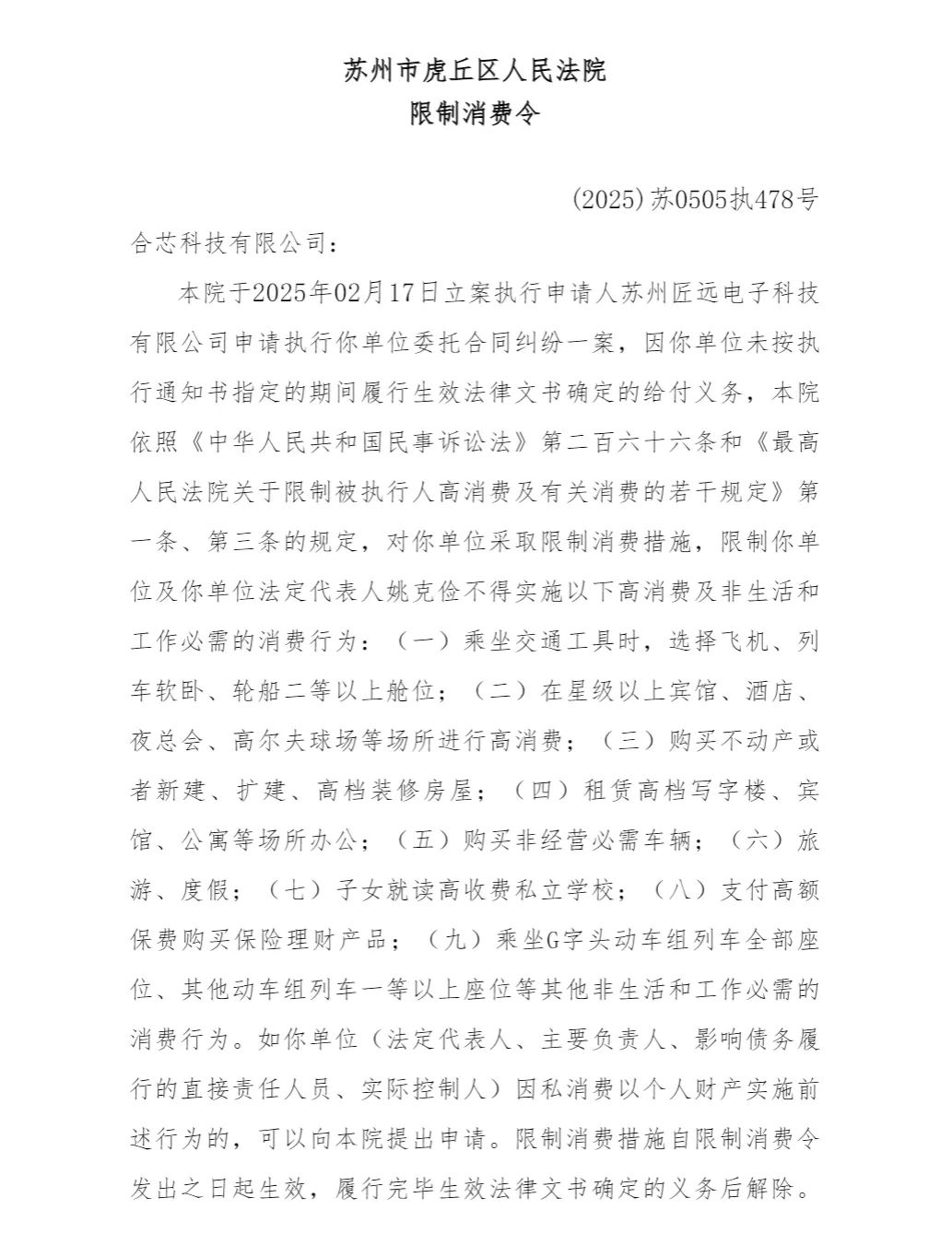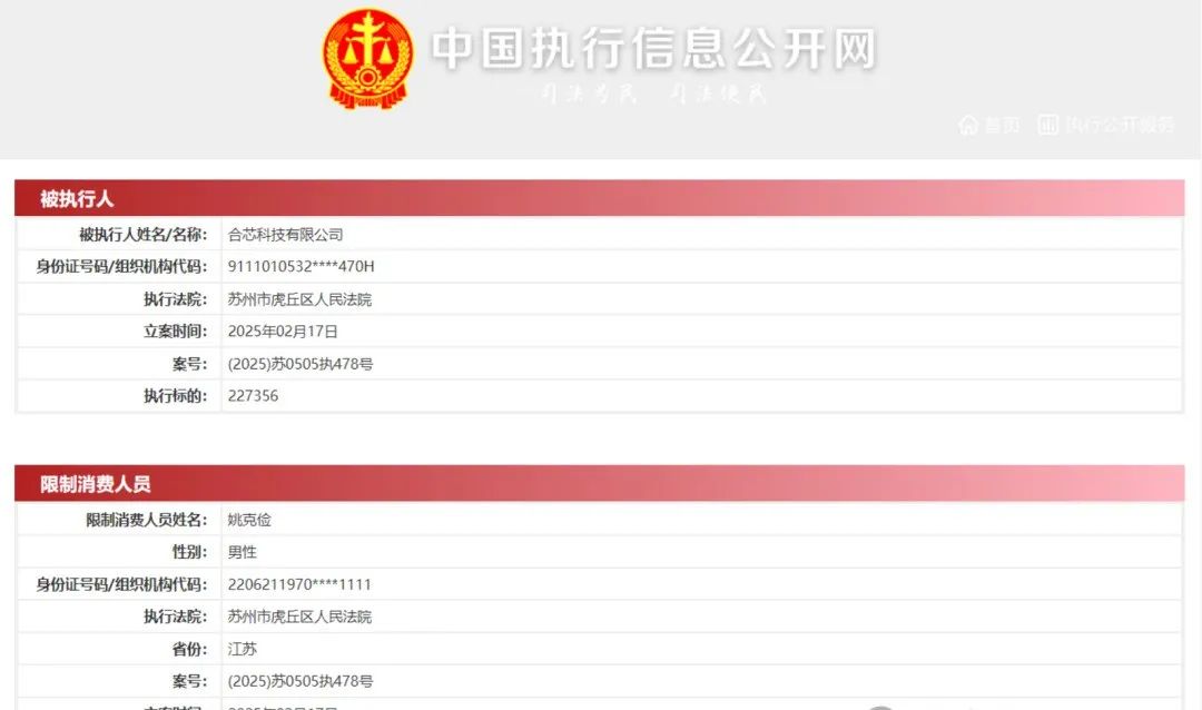 IT之家 2 月 27 日消息,苏州市虎丘区人民法院 2 月 25 日针对国产服务器 CPU 企业合芯科技及其法定代表人姚克俭发出限制消费令,姚克俭被禁止实施高消费及非生活和工作必需的消费行为。
