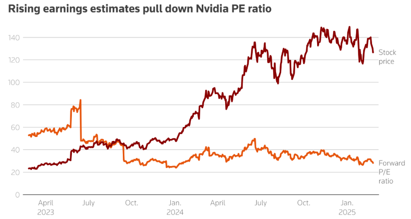 英伟达的收益被广泛视为经济的晴雨表,过去两年的经济增长在很大程度上是由对人工智能和数据中心容量建设的投资推动的。更广泛地说,美国经济正显示出放缓的迹象,人们对消费者的实力以及与特朗普征收关税计划相关的更高通胀前景提出质疑。