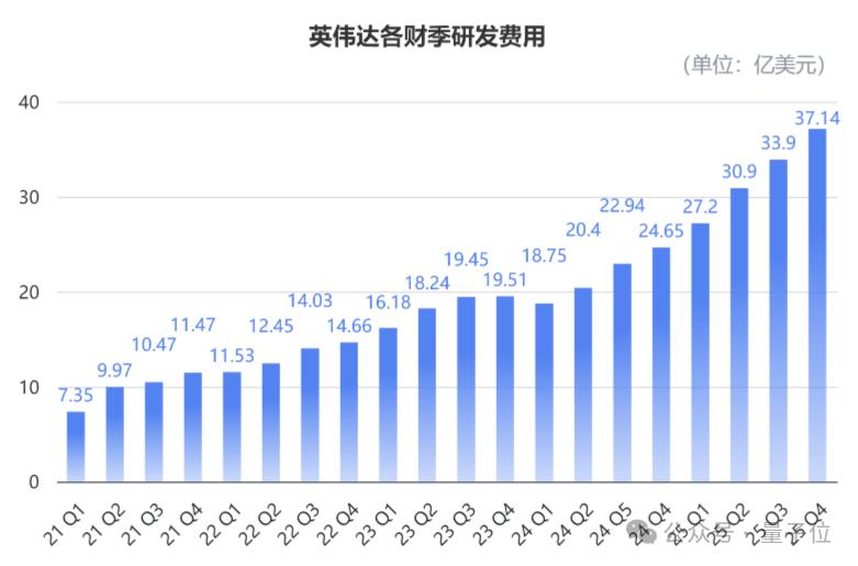 也正因产品进程受到阻滞,英伟达在研发上投入的热情空前高涨,第四季度公司研发费用为37.14亿美元(约270亿元),同比增长50.7%,环比增长9.6%。