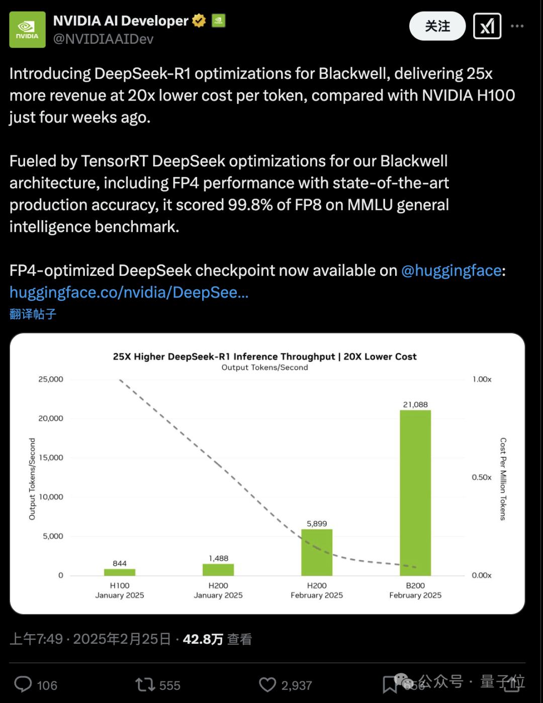 并且英伟达也在积极拥抱DeepSeek,官方发布针对Blackwell优化的R1版本将每个token成本降低到1/20,吞吐量提高到25倍。