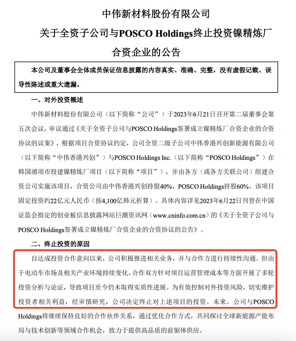 中伟股份称,由于电动车市场及相关产业环境持续变化,合作双方针对项目运营管理成本等方面开展了多轮投资分析与论证,导致项目至今仍未取得实质性进展。公司决定终止对该项目的投资。