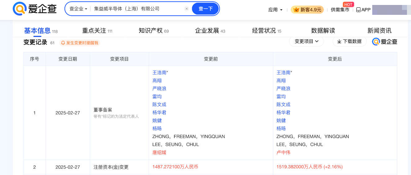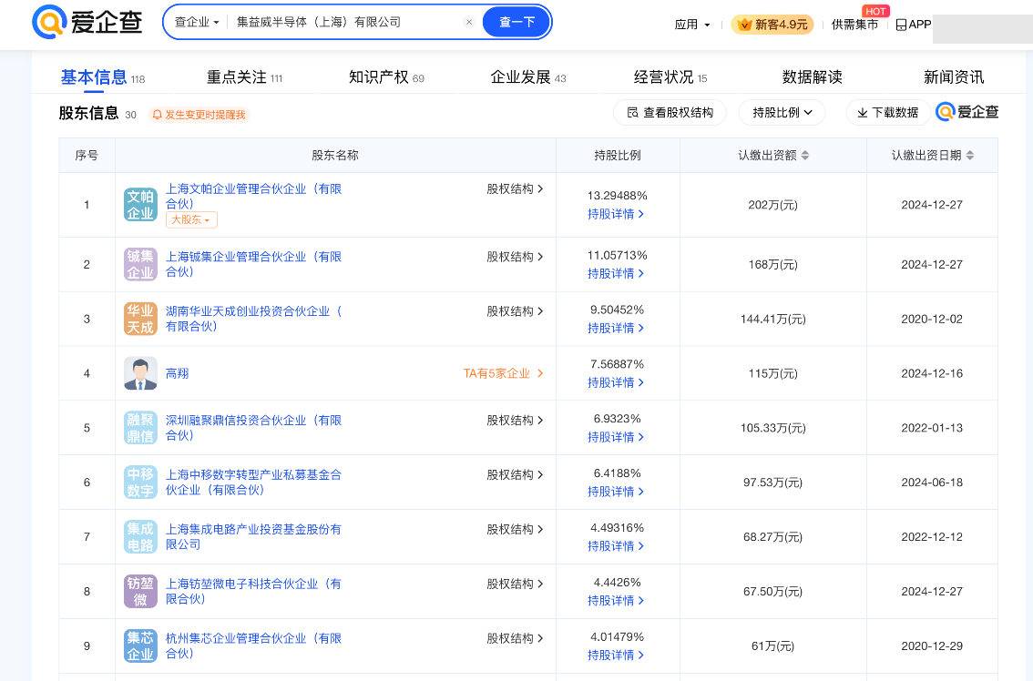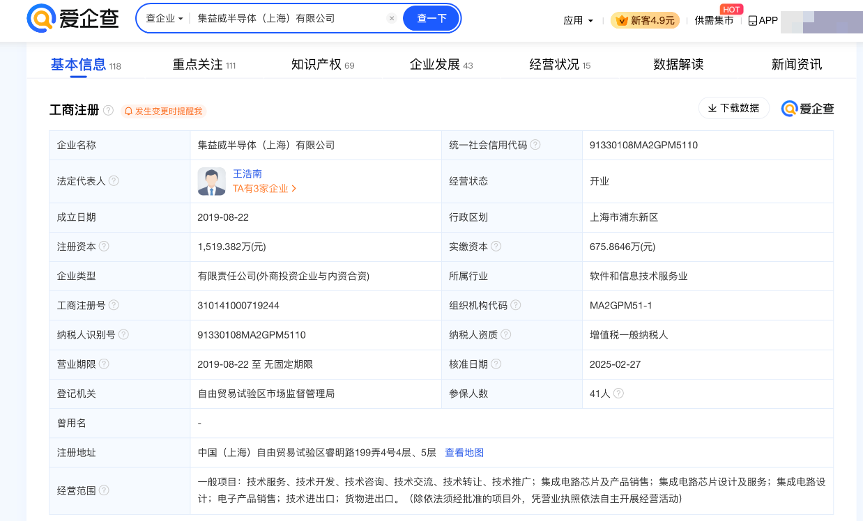 集益威半导体(上海)有限公司成立于2019年8月,法定代表人为王浩南,经营范围包括集成电路芯片及产品销售、集成电路芯片设计及服务、电子产品销售等。股东信息显示,该公司现由上海文帕企业管理合伙企业(有限合伙)、国家集成电路产业投资基金二期股份有限公司及上述新增股东等共同持股。