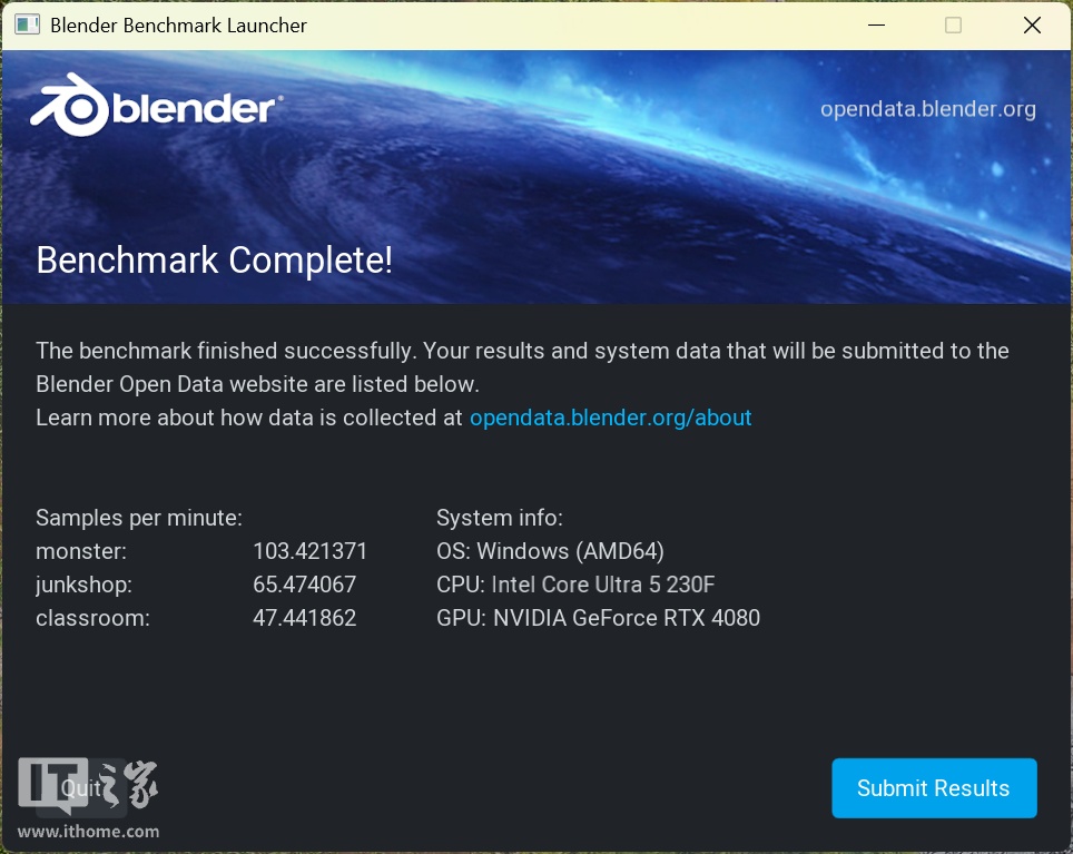 接着是代表性很强的专业建模软件 Blender,运行 Blender Benchmark 测试,Ultra 5 230F 的 monster 最终为 103 分,junkshop 为 65 分,而 classroom 为 47 分。简单的建模渲染同样难不倒它。