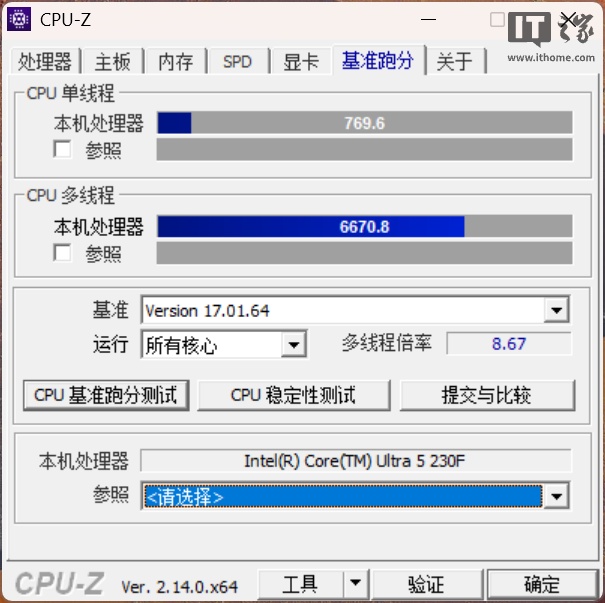 我们通过 CPU-Z 自带跑分项目进行测试,Ultra 5 230F 的单核分数为 769.6 分,多核分数为 6670.8 分。