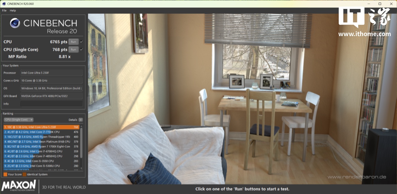 在 CineBench R20 的测试中,Ultra 5 230F 获得了单核 768 分,多核 6765 分的成绩。
