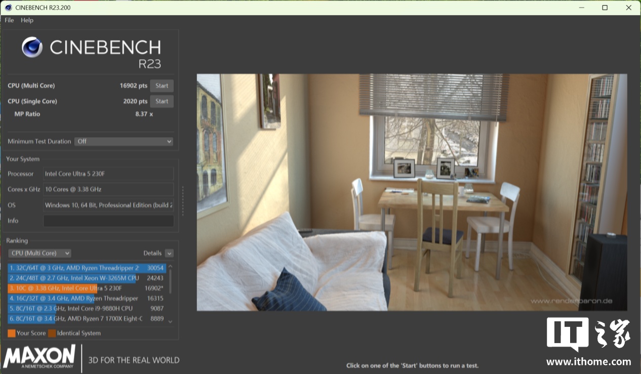 在 CineBench R23 的测试中,Ultra 5 230F 获得了单核 2020 分,多核 16902 分的成绩。