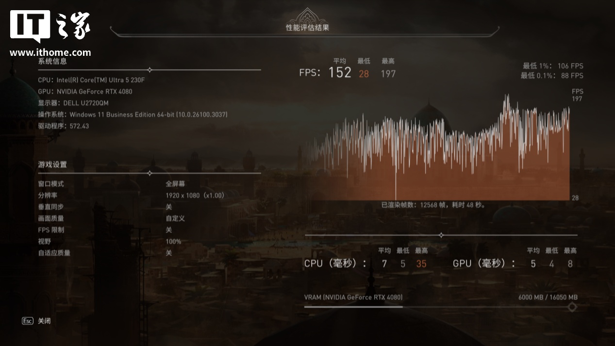 另一款动作冒险游戏《刺客信条:幻景》,1080P 分辨率 + 极高画质,运行游戏自带基准测试,Ultra 5 230F 的平均帧数有 162 帧。
