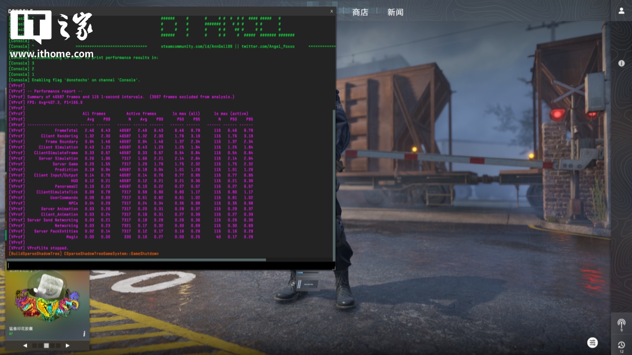 首先测试 2 款在线竞技游戏,在《CS2》游戏中选择 1080P 分辨率 + 默认画质(高),进行 BenchMark 测试,实测 Ultra 5 230F 的平均帧数为 407 帧,1% Low 帧为 158 帧,相比 i5-14490F 平均帧率提升约 18% 完全不用担心游戏体验。
