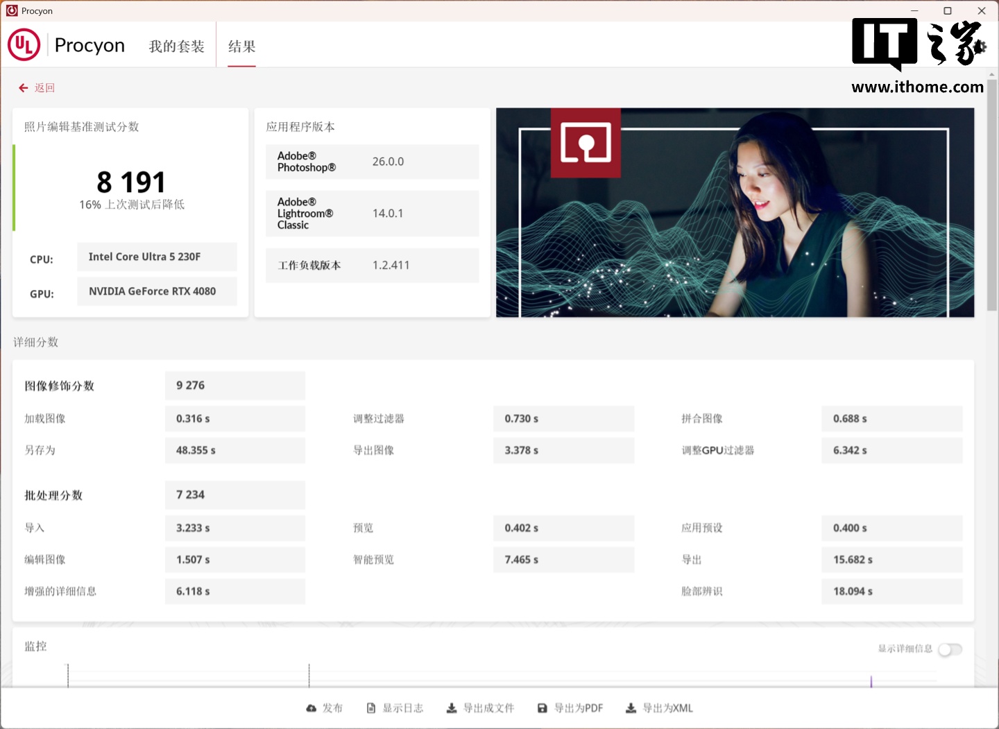 专业创作工具方面的表现,首先是考验 CPU 性能的图片编辑能力,我们使用的软件为 Proycon,它可以调用 Ps 与 Lr 进行自动编辑渲染,其最终得分为 8191 分。