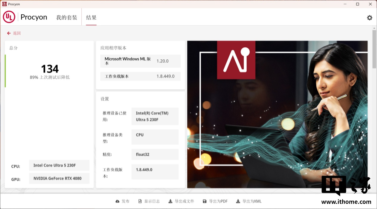 最后我们再来看看 AI 推理性能,使用的软件是 Procyon,选择渲染方式为 CPU,最终得分为 134。