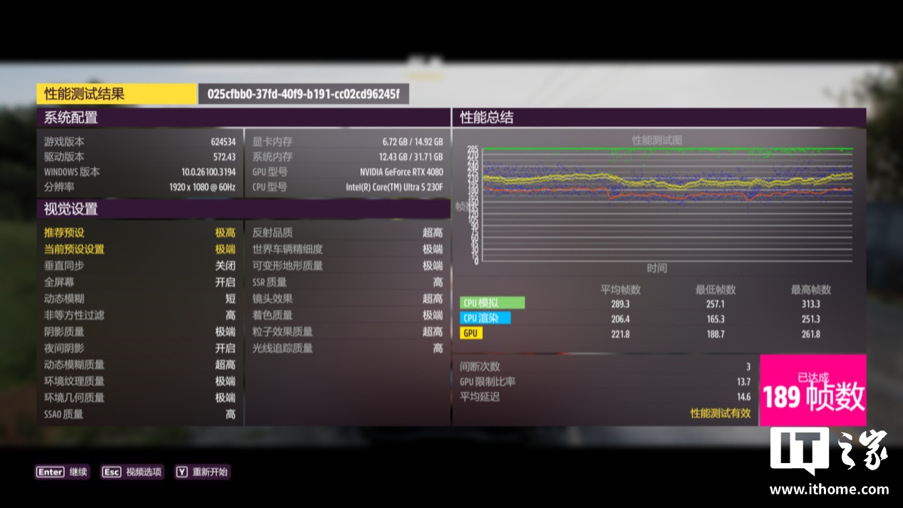 在以出色优化而闻名的《极限竞速:地平线 5》中,以 1080P 分辨率 + 极端画质(光追等级高)的设置运行游戏自带的基准测试,Ultra 5 230F 的平均帧数高达 189 帧。
