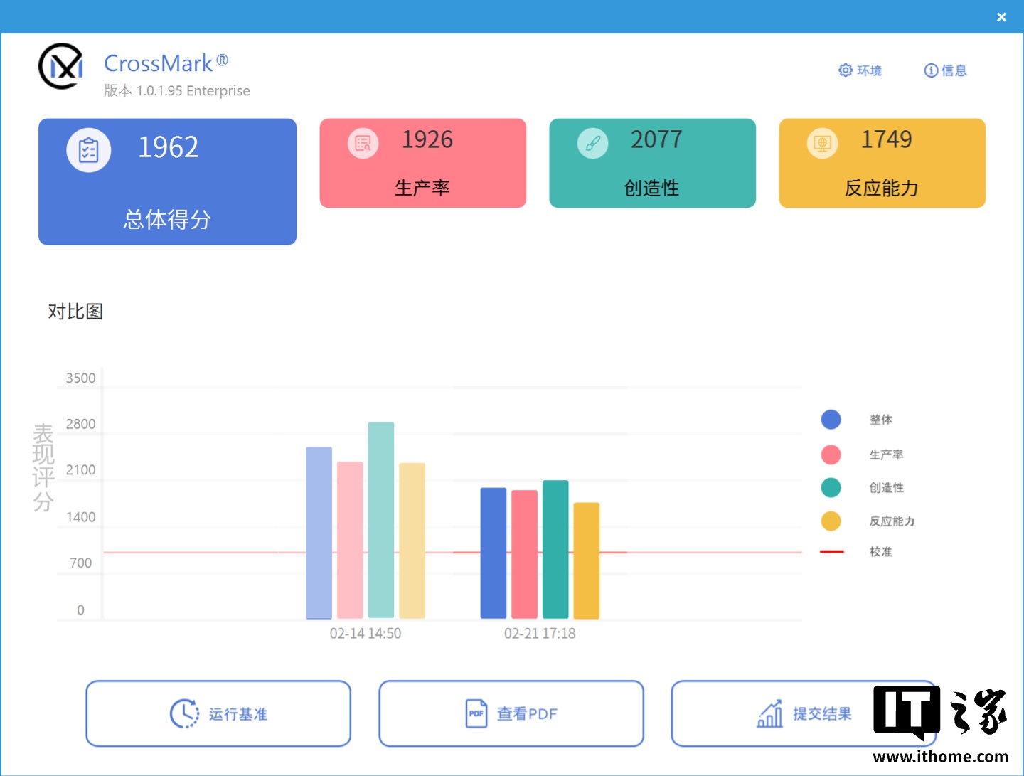 考验 CPU 综合生产力效率的 CrossMark 测试,Ultra 5 230F 的总分为 1962 分,3 个子项分数也分别来到了 1926 分(生产力),2077 分(创造性)和 1749 分(反应能力),轻松通过测试。