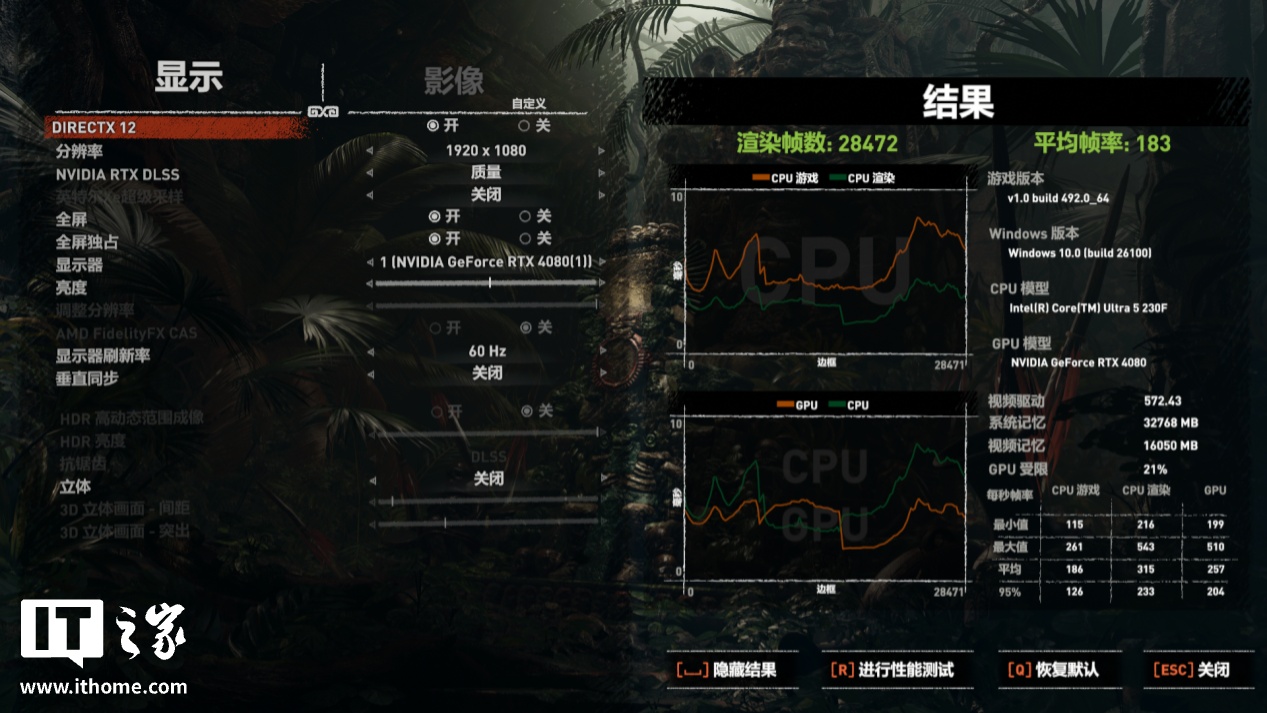 接下来是几款 3A 游戏,首先是《古墓丽影:暗影》,在 1080P 最高画质下运行游戏自带基准测试,不开光追和 DLSS 选项,Ultra 5 230F 的平均帧数为 183 帧。