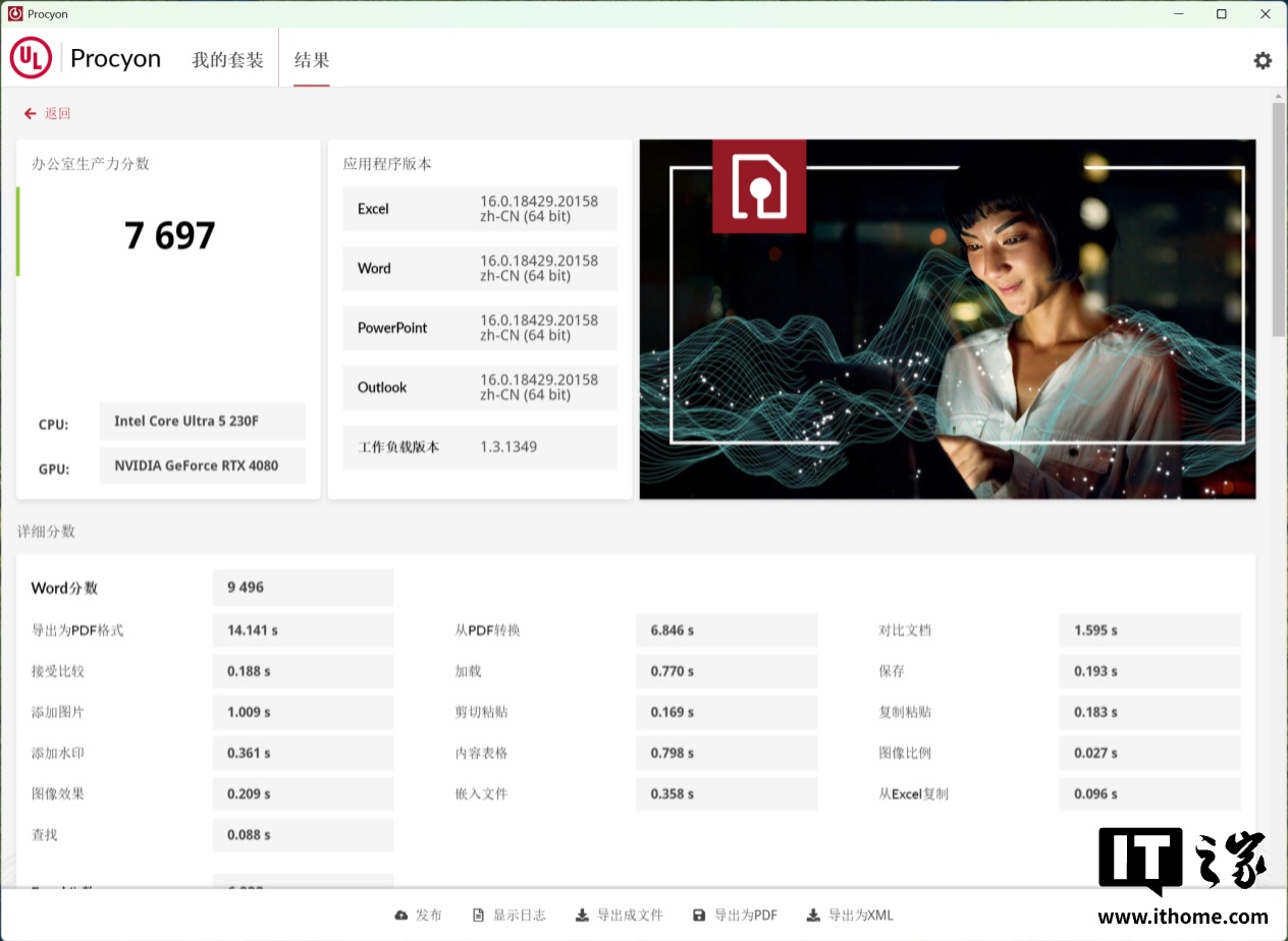 接下来我们再来了解一下这款 CPU 在办公生产力,日常办公方面,我们使用 Proycon 对 Office 套件的性能表现做了测试,其总分为 7697 分,Ultra 5 230F 应对日常轻度办公还是很轻松的。