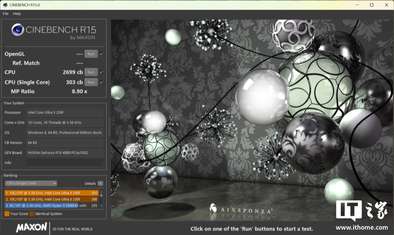 在 CineBench R15 的测试中,Ultra 5 230F 获得了单核 303 分,多核 2699 分的成绩。