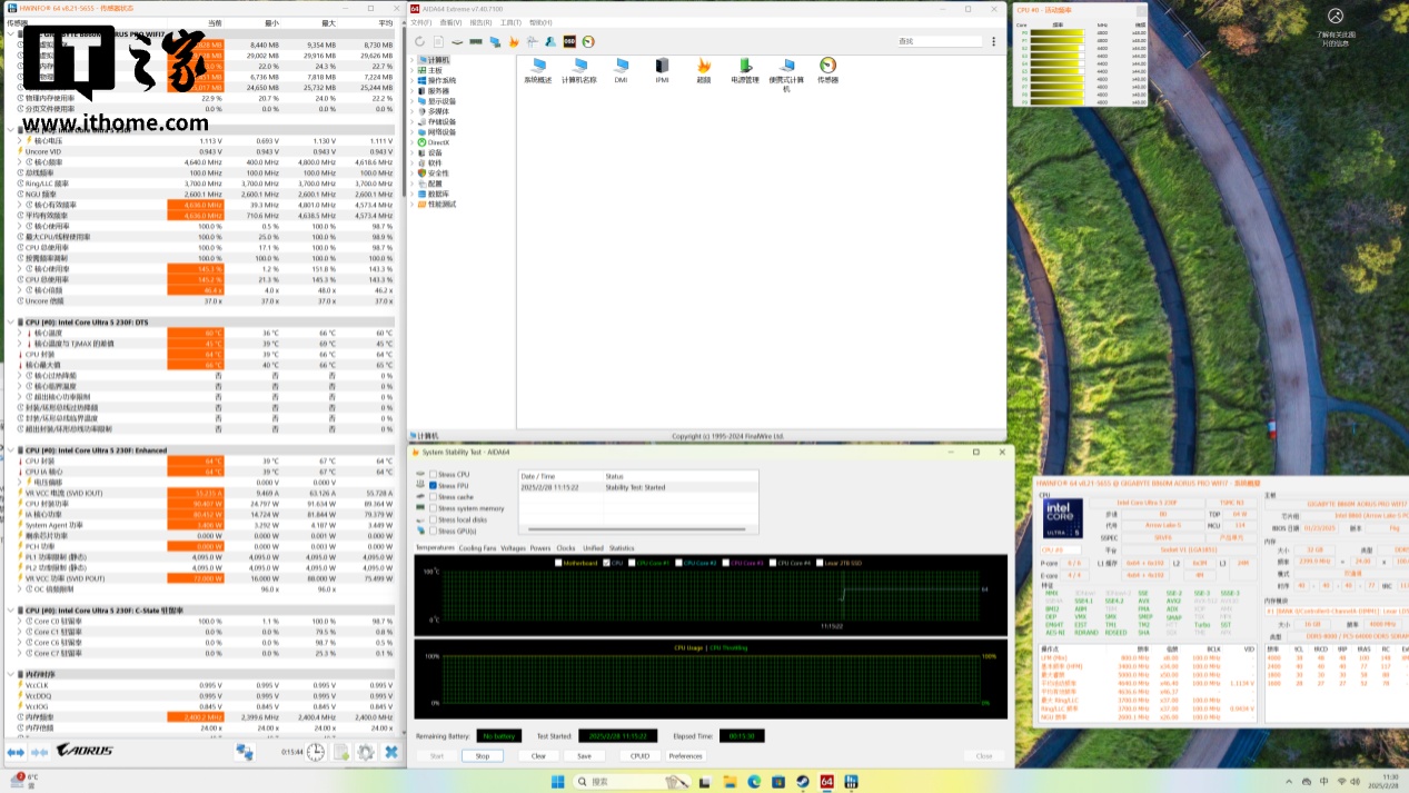 最后再看一下它的烤机稳定性和功耗表现好了,我们照例使用 AIDA64 的 FPU 单烤测试,Ultra 5 230F 的表现非常平稳,全程保持在 60 °C 的封装温度,功耗也维持在 90W。CPU 频率方面,P 核维持在 4.8GHz,而 E 核则保持在 4.4GHz 左右,只要有个靠谱的散热,就能压得住 Ultra 5 230F。