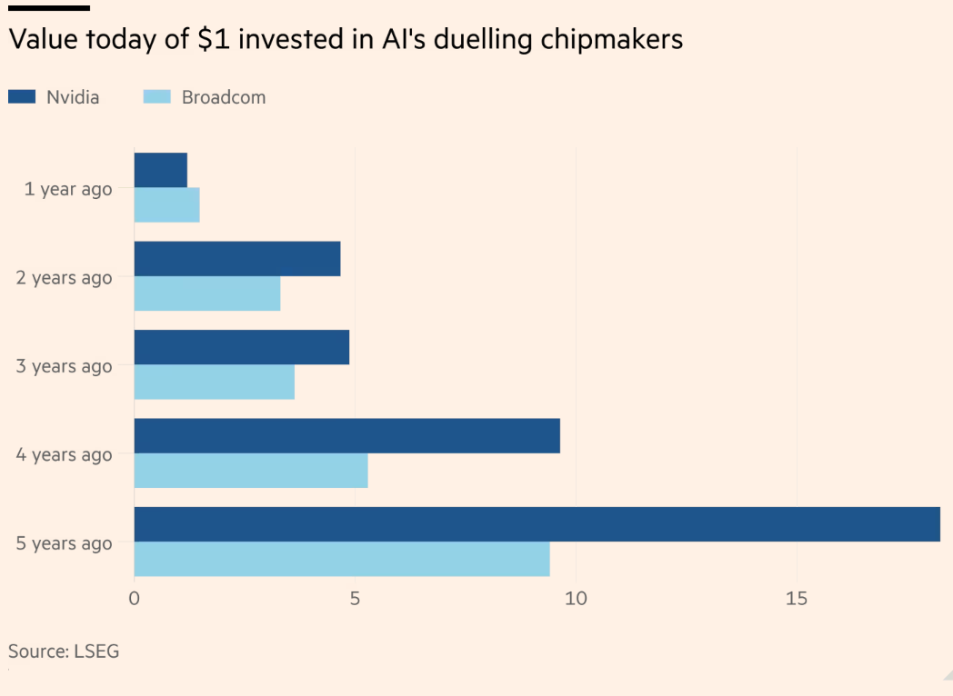 凤凰网科技讯 3月7日,金融时报发文表示,虽然英伟达在如今的芯片行业如日中天,但过去一年里,其对手博通的投资收益更好。博通更受投资者青睐,在数据中心领域及选股者投资组合中,渐渐占据了优势 。金融时报称,对于强大的英伟达,博通的回应是“嗤之以鼻”。
