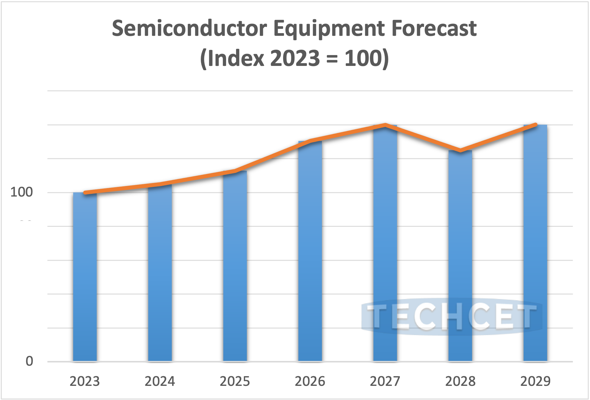 电子材料咨询公司TECHCET的最新数据显示全球半导体设备市场预计在2025年实现8%的增长,并将在2027年前保持稳定增长的态势。这一增长趋势是在2024年市场小幅反弹约5%的基础上实现的。