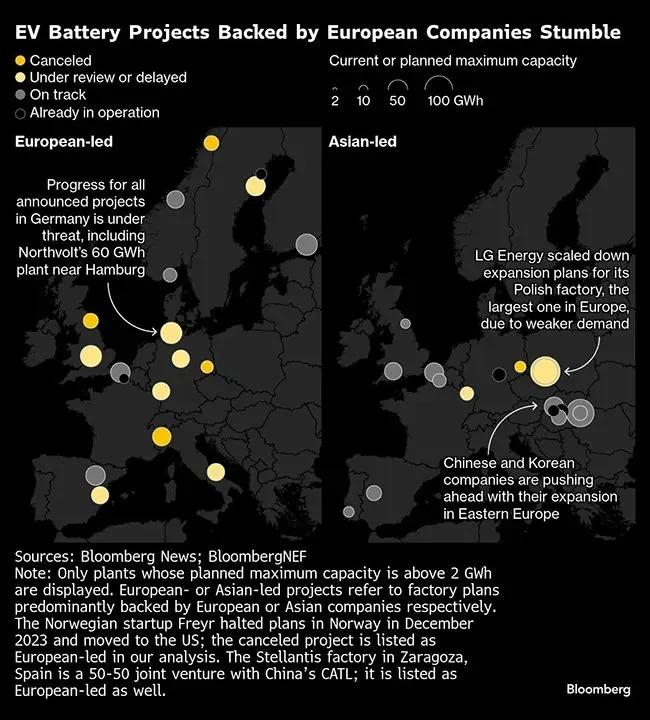 彭博社在去年底的一份分析中,列举了欧洲电池产业的“死亡名单”:北欧,挪威的Freyr已经暂停电池生产,瑞典的昔日明星、欧洲全体供养的Northvolt公司已进入破产程序。西欧,英国Britishvolt申请了破产保护,法国Verkor技术路线走错,投产就落后一代,