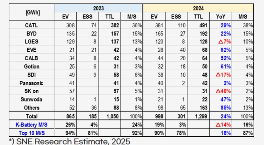 日前,韩国研究机构SNE Research发布了2024年动力及储能电池出货排名榜单,一个重要的信号出现——不管是动力电池还是储能电池,中国企业都遥遥领先。TOP10排名中,原本中日韩“三国杀”的格局,变成六家中国企业以合计69%的市占率碾压全场,三家韩国企业以16%的市占率勉强苟住,而日本企业只剩了一家市占率3%的松下苟延残喘。