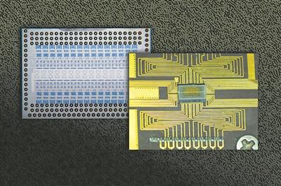 通过在芯片背面粘贴一层薄薄的图案化材料,研究人员制作出了一种更高效且可扩展的基于芯片的太赫兹波发生器。图片来源:美国麻省理工学院