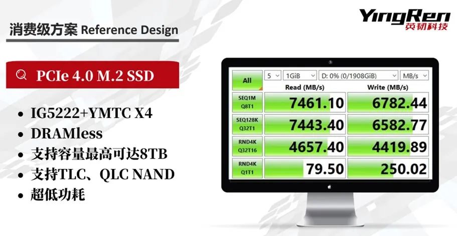 英韧表示 IG5222 主控新品追求极致的 PPA 优化,具有更好的性能、更低的功耗和更小的芯片面积。其基于更先进的硬件加速设计,拥有更优秀的 HMB 性能,最高顺序读写分别可达 7400MB/s 和 6800MB/s,最高随机读写均为 1200K IOPS。