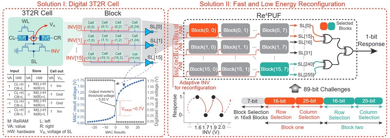 基于忆阻器(ReRAM)的物理不可克隆函数(PUF)因其低能耗和紧凑尺寸的优势,已成为一种具有研究和应用前景的硬件安全原语。然而,现有的基于ReRAM的PUF的可靠性会受到环境的影响,同时也面临深度神经网络建模攻击和侧信道攻击(SCA)的威胁。本文提出了一种新型的3T2R ReRAM可重构PUF(见图1),通过数字3T2R的分压单元设计,提高了基于ReRAM的PUF可靠性。通过调节反相器的供电电压,使PUF无需重擦写ReRAM即可快速、低成本地实现重构,从而防御DNN建模和SCA的威胁。