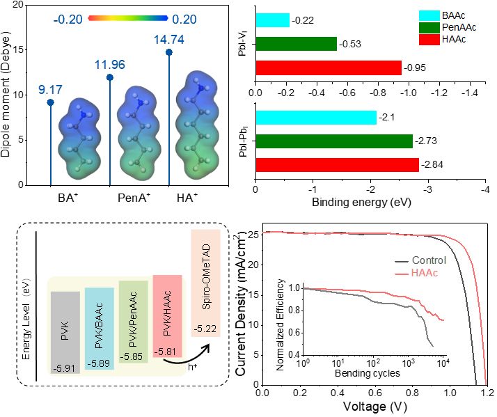 界面调控技术能够有效钝化钙钛矿薄膜缺陷并调控界面能级,从而提高钙钛矿太阳能电池的光伏性能。研究团队对比了具有不同偶极矩的醋酸胺离子液体对钙钛矿与空穴传输层界面修饰效果,获得了高效稳定的钙钛矿太阳能电池。研究发现具有高偶极矩的己基醋酸胺可以显著降低钙钛矿与空穴传输层之间的能级差,有利于空穴的提取并减少能量损失。此外,己基醋酸胺中的HA+阳离子和Ac-阴离子对钙钛矿表面的施主和受主缺陷均表现出很强的结合能力,从而有效抑制缺陷辅助复合。能级调控和缺陷钝化的协同作用,使得器件的光电转换效率和运行稳定性均得到显著的提升。同时,柔性钙钛矿太阳能电池表现出优异的机械稳定性,进一步推动了其在柔性电子领域的应用潜力。