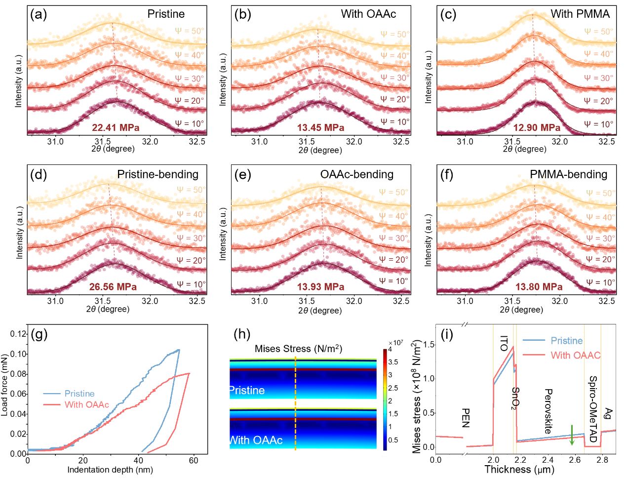 柔性钙钛矿太阳能电池因其质轻、可变形和高效率的特性,在便携式可穿戴电子领域有广泛的应用前景。然而,柔性器件在弯曲过程中承受着较大的应力,会导致功能层开裂,进而影响柔性钙钛矿太阳能电池的光电转换效率和长期稳定性,限制其商业化应用。该团队在钙钛矿表面引入了一种具有本征柔性的长链分子——辛基乙酸胺(OAAc)作为表面粘附层和应力释放层。通过理论分析与实验验证,发现OAAc层可以有效释放弯曲过程中的应力,进而提高柔性钙钛矿太阳能电池的机械稳定性。此外,OAAc可以与钙钛矿表面的缺陷相互作用,降低钙钛矿薄膜的缺陷态密度并降低非辐射复合损失。采用这种方法,刚性器件的效率从23.14%提高到25.47%(柔性器件为23.12%)。相应的柔性器件具有优异的机械稳定性,在5mm弯曲半径下,经过8000次弯曲循环后仍能保持初始效率的74%以上。