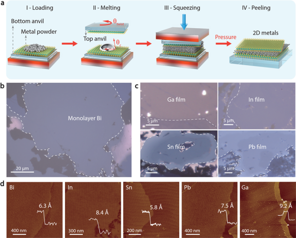 此项研究中,团队将金属熔化,并利用团队前期制备的高质量单层二硫化钼压砧进行挤压,实现了多种二维金属的普适制备,包括铋、锡、铅、铟和镓。团队制备的二维金属材料横向尺寸较此前同类材料实现了大幅提升,并且具有良好的环境稳定性,在超1年的实验测试中无性能退化。