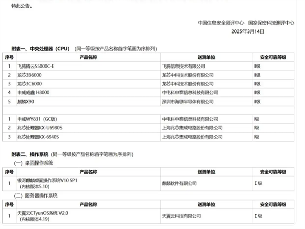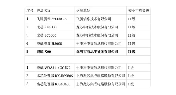 从公布的信息可以看出,这次公布的国产电脑芯片,有申威H8000、飞腾腾云S5000C-E、龙芯3B6000/3C6000以及华为麒麟X90获II级认证。