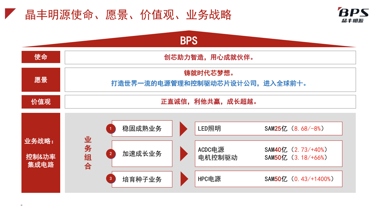 胡黎强分享了晶丰明源的企业使命:“创芯助力智造,用心成就伙伴”,以及愿景:“打造世界一流的电源管理和控制驱动芯片设计公司,进入全球前十”。他指出,晶丰明源在选择并购标的时,不仅关注技术和市场潜力,更注重与公司使命和价值观的契合度。胡黎强提到,晶丰明源倡导“正值诚信(真)、利他共赢(善)、成长超越(美)”的价值观,通过这种高阶文化,晶丰明源成功整合了来自不同背景的团队,包括清华、浙大等高校的优秀人才。