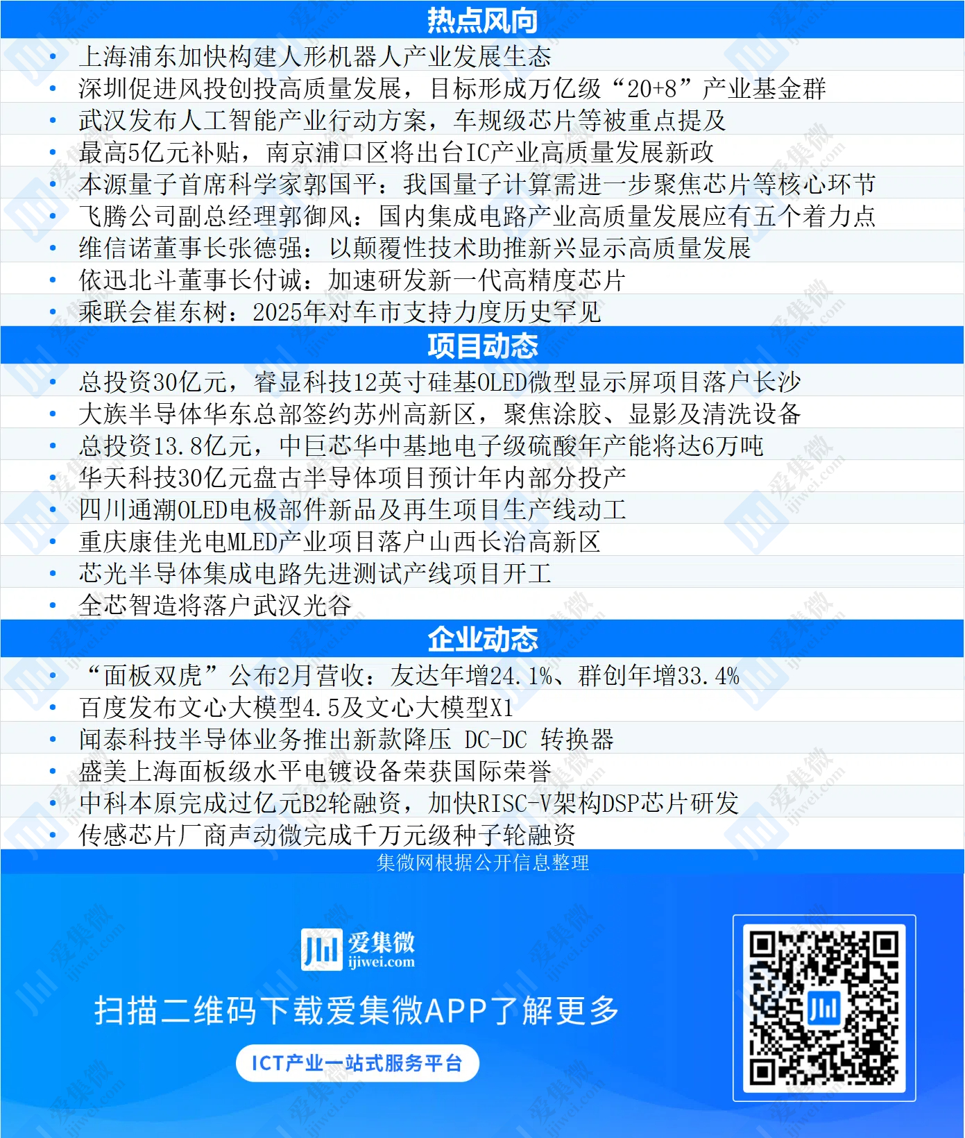 本周以来,深圳促进风投创投高质量发展;武汉发布人工智能产业行动方案;南京浦口区将出台IC产业高质量发展新政;中巨芯华中基地电子级硫酸年产能将达6万吨;睿显科技12英寸硅基OLED微型显示屏项目落户长沙;华天科技30亿元盘古半导体项目预计年内部分投产;百度发布文心大模型4.5及文心大模型X1……