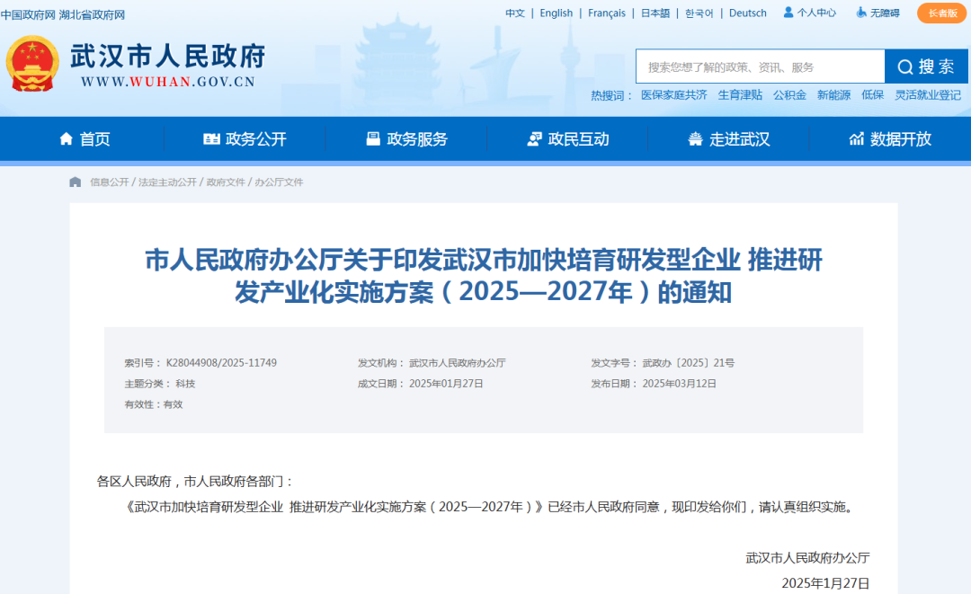 3月12日,《武汉市加快培育研发型企业 推进研发产业化实施方案(2025—2027年)》(以下简称《实施方案》)发布,提出积极发展首发经济,支持“四首”(首台重大技术装备、首批次新材料、首版次软件、首轮次工程流片芯片)应用,加速创新产品产业化和迭代升级,并择优给予单个项目最高1000万元支持。