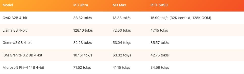 另外,还有像 TensorRT-LLM 这样的工具,可以把模型量化成 Blackwell 支持的原生 fp4 数据类型,但 Max Weinbach 透露,在尝试给 RTX 5090 编译时,遇到了不少错误,也没时间慢慢调试。理论上,如果用上 Nvidia 官方的优化,RTX 5090 在 Windows 上的表现应该比上面的测试结果好得多,但问题还是出在内存上——RTX 5090 只有 32GB,而 M3 Ultra 起步就是 96GB,最高能到 512GB。
