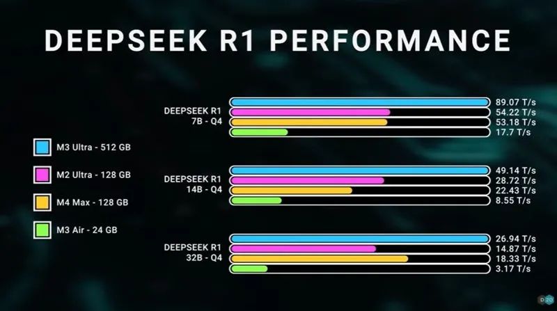 测试中,Dave Lee 把 M3 Ultra 跑 DeepSeek R1 的表现跟苹果之前的芯片做了对比。像 R1 这么大的模型,传统 PC 方案通常需要多块 GPU 配合超大显存才能撑得住,功耗也会飙升。但 M3 Ultra 依靠统一内存架构,让 AI 模型可以像使用 VRAM 一样调用高带宽内存,单芯片就能高效运行。
