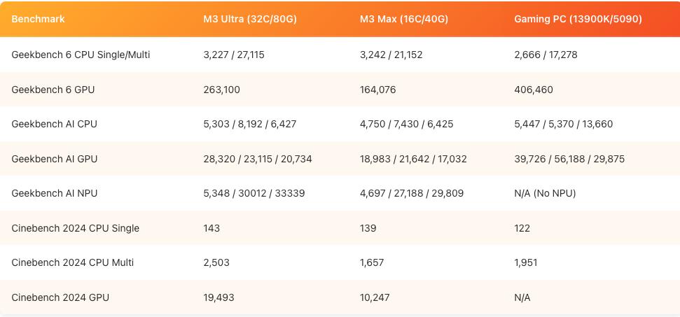 为了验证这一点,他对 M3 Ultra、M3 Max 和自己的游戏 PC 进行了 Geekbench AI 基准测试。