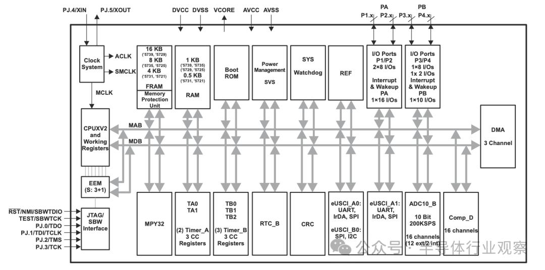 MSP430FR57xx系列框图,其提供20种不同的器件,FRAM存储器容量高达16 kB(来源:TI)