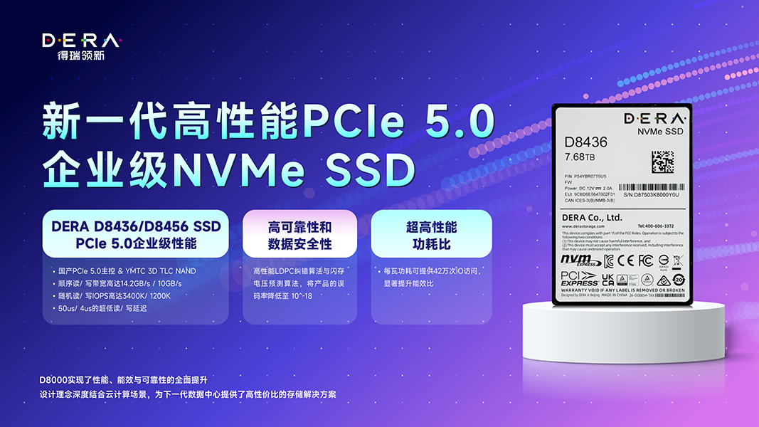 IT之家 3 月 17 日消息,得瑞领新(IT之家注:DERA,曾称为紫光得瑞)本月 12 日在 CFMS | MemoryS 2025 峰会上发布了新一代 D8000 系列 PCIe 5.0 企业级固态硬盘,包含 D8436 和 D8456 两个分支版本。