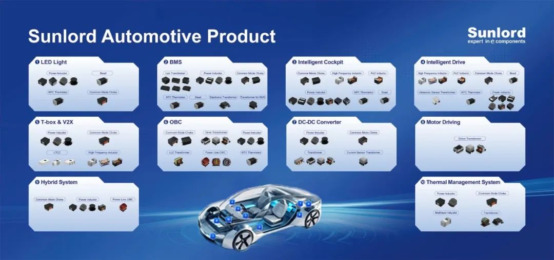 顺络汽车电子产品应用广泛,涵盖电池管理系统、车载照明、智能座舱系统、智能驾驶、T-BOX & V2X、车载充电机、DC-DC转换器、48V混动系统、电机驱动、热管理系统等10大领域,主要产品包括变压器、功率电感、共模电感、射频电感等。可根据客户需求进行定制,多方面助力新能源汽车发展!顺络汽车产品在技术性能及质量管理上已得到了客户的高度认可,已经被国内外众多汽车电子企业及tier1零部件供应商批量采购。