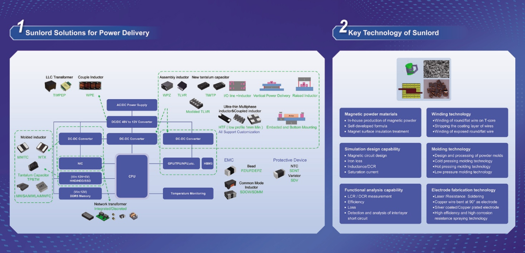 随着全球AI服务器市场持续增长,顺络电子在48V转12V及12V转1.1/0.8V等领域,开发了多个新产品系列,基于超低压整版模压技术实现的低高度、低损耗耦合电感/多相电感、高耐压的TLVR电感、基于铜磁共烧技术的4-ph耦合电感等,为AI服务器垂直供电、电源模块助力。