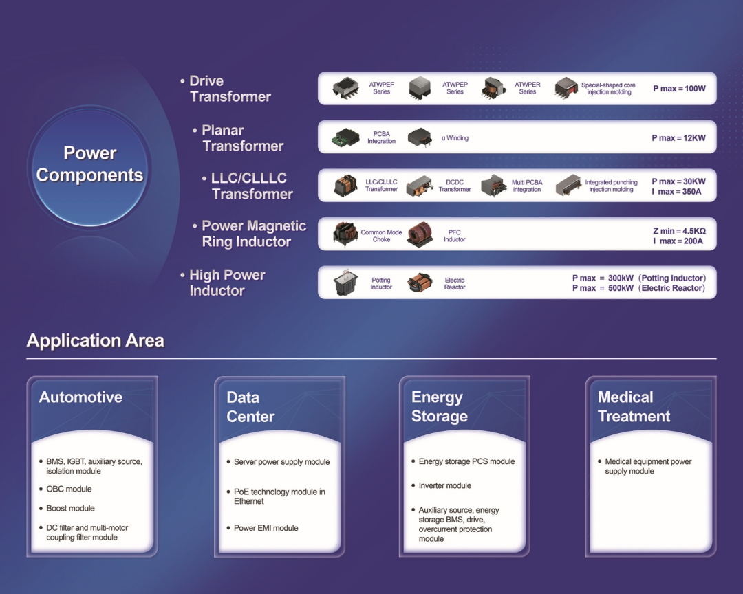 随着AI服务器、光伏储能、智能储能和电动汽车等行业的发展,电源和磁性器件领域迎来变革。AI服务器的高算力需求使其电源功率大幅提升,单台功率可达数千瓦,甚至更高。这推动电源向高频化、智能化、高效化方向发展,同时对散热和稳定性提出更高要求。磁性器件作为电源核心组件,需求也显著增加,如高端AI服务器主板上的一体成型电感数量大幅上升,其性能和集成度成为关键。而电动汽车和光伏储能行业的发展则对电源的稳定性和可靠性提出更高要求,系统电压提升和功率密度增加,促使磁性器件向更高效率、更低损耗方向发展。顺络电子通过材料改进、工艺创新、模拟仿真等方式,推出了各类新型的大功率器件,包括PCBA集成式大功率平面变压器、一体冲压注塑变压器、低损耗PFC线圈等多种产品和应用解决方案。